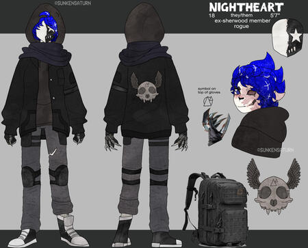 The naming system in Sherwood is highly inspired by how characters are named in the Warriors franchise, though not every member will have a name like that.Nightheart's mask is inspired by the "two face" trope, one side is white; implying to be innocent and caring, while the other is dark, and hides many awful secrets. The teeth on the left side only add to that.Nightheart will usually speak through ASL, or through a cassette tape (Heavily inspired by how Jacket speaks in Payday 2), however they can speak- Their voice is just very raspy.